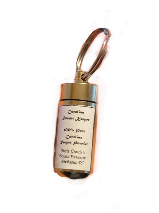 Convenient keychain for your Carolina Reaper powder – put this in sauces, soups, chili, tacos, eggs and grits, anything and everything!